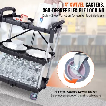 Foldable Utility Service Cart 3 Shelf with Lockable Wheels for Heavy Loads